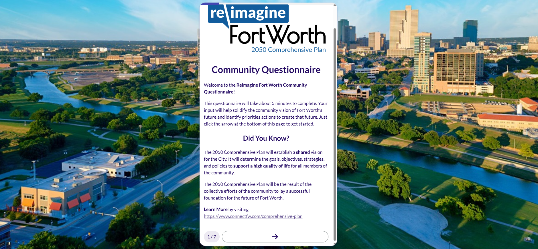Help the City build our new 2050 Comprehensive Plan by completing the survey here. The survey should only take about five minutes, and by doing so, you will help solidify the community vision of Fort Worth's future and identify priorities actions to create that future.